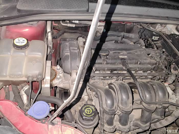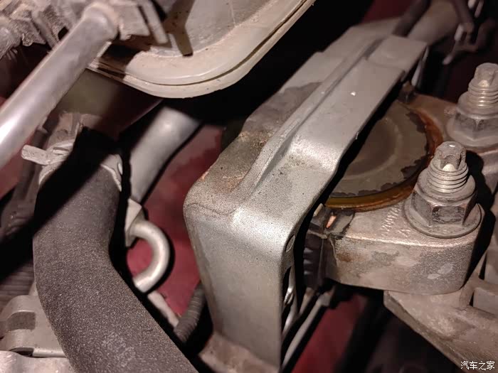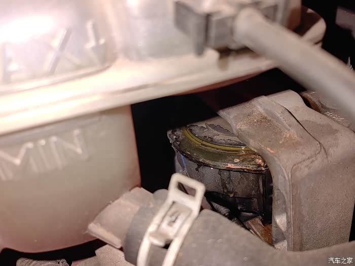 一两个月前刚换过防冻液,最近发现防冻液副水壶漏水,滴在发动机机脚胶上。