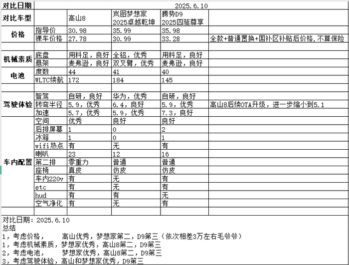 一图看懂梦想家-高山8-腾势D9主要对比