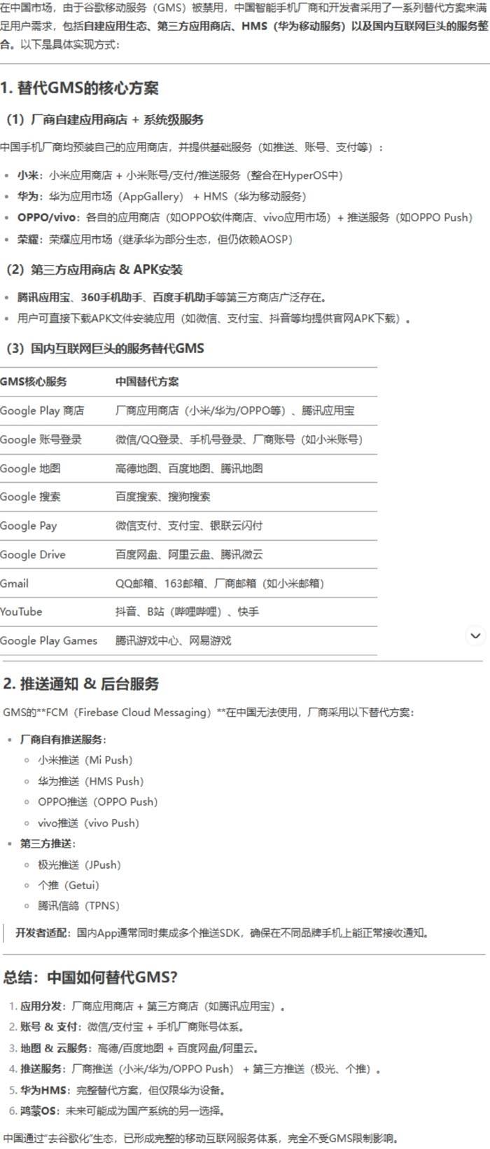 不过可能很多人不知道其实GMS在中国是不能用的,国内厂商都有自己的应用生态,例如各自的手机应用商店等,还有大量的第三方应用互联网应用商店支持APP安装和更新。而只有在国外销售的手机才需要GMS,这也是为啥华为被谷歌禁用GMS其实国内受影响不大的原因。