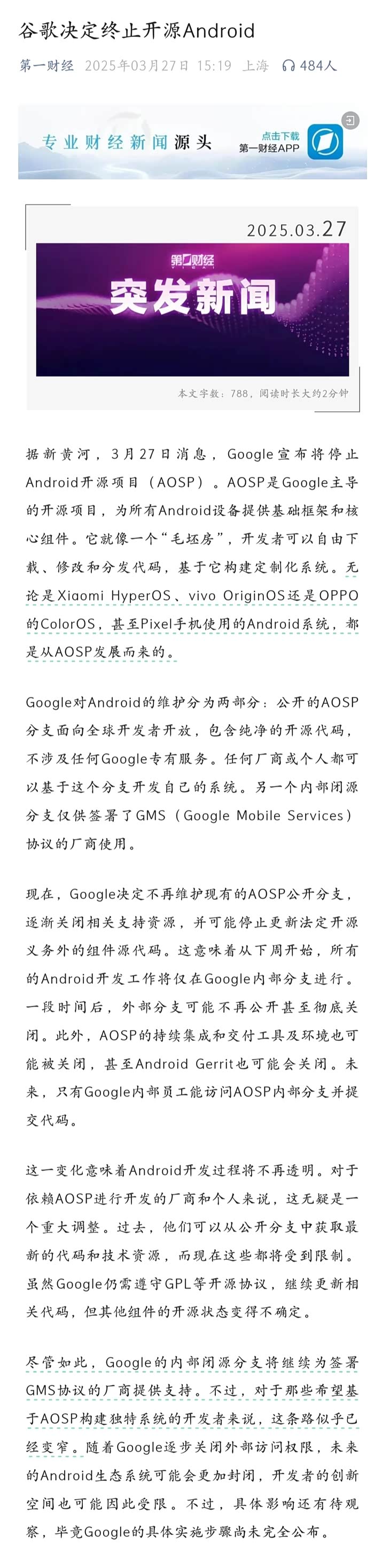 其实谷歌的对安卓的维护分开源分支(AOSP)和闭源内部分支(GMS)两块,后面不在维护的是开源分支,对后面的闭源分支没有影响。