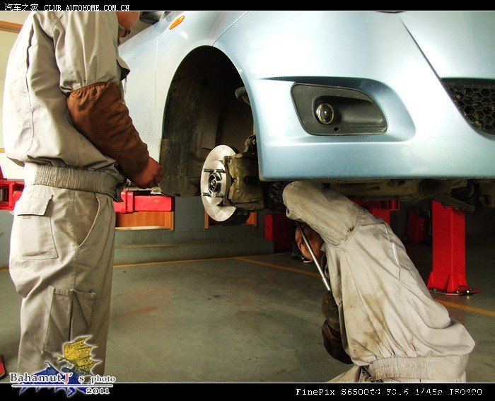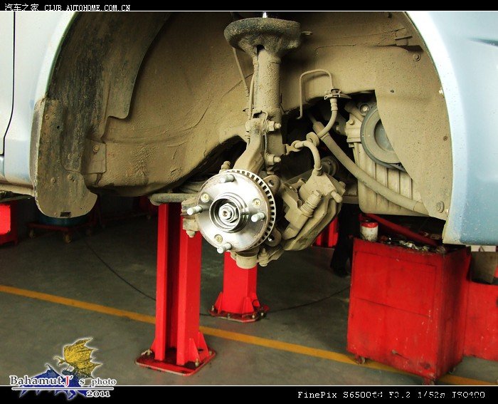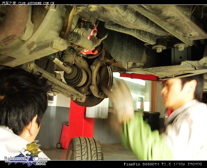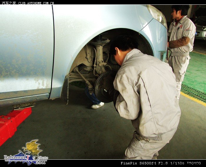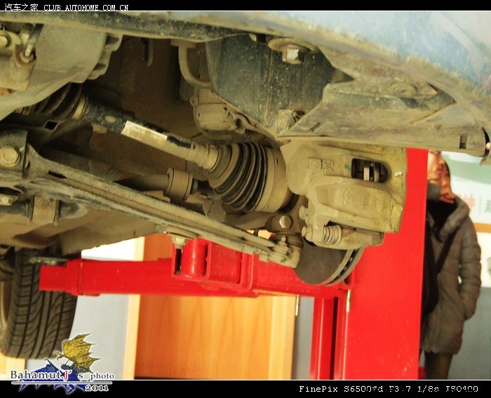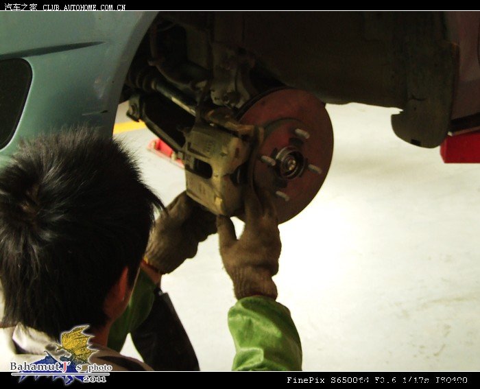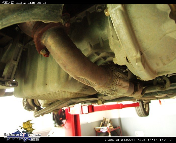 4、在他们拆刹车盘的空挡,我又看了下排气管,看样子春节期间下乡又把这里给撞了个坑,无语ing