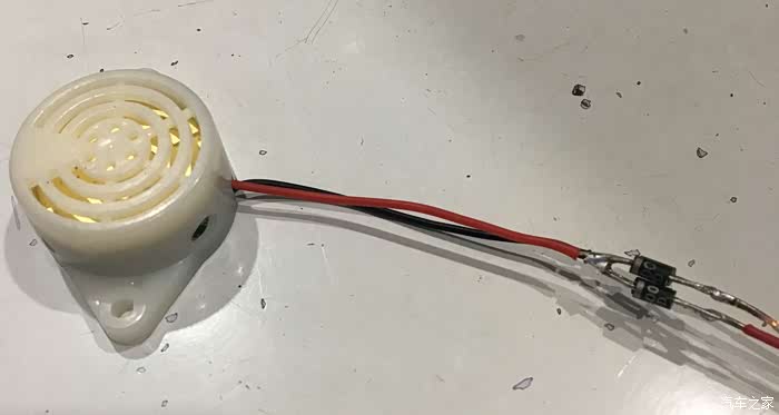 我这不买了2个蜂鸣器吗?得!把2只蜂鸣器的正负极交叉连接,再并联到转向指示灯的线路上,这下不管打左转向还是右转向,总有一个蜂鸣器在工作