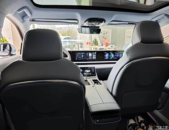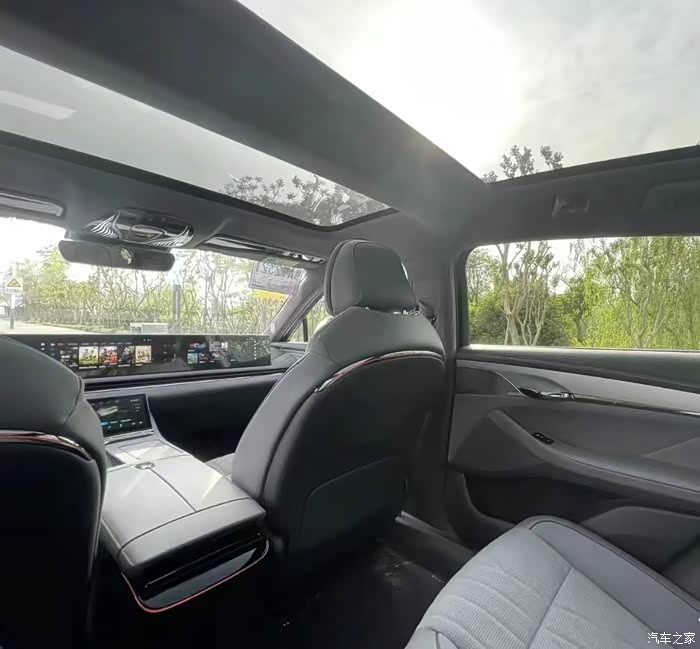大型轿车,空间方面自然没得说,后排非常宽敞。而且值得注意的是,岚图追光配备了分体式天窗与电动遮阳帘,对比同价位电动车,还是有明显的优势的,坐到车里面实际感受了一下,虽然是轿车,轴距是真大,坐在后排都可以翘二郎腿,头顶距离天幕约两拳距离,空间堪比普通 SUV 。内饰用的是软乎乎的那种毛料,不是真皮,坐着是真舒服。真皮座椅夏天烫屁股,冬天拔屁股。
