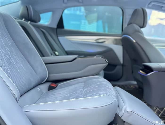 一打开车门就能感觉到内饰用料还不错,目光所到之处皆是软性材料包裹,连顶棚都是翻毛皮材质,摸起来手感很棒。岚图追光的座椅没有使用传统的真皮,而是一种超纤维材质,摸起来的手感接近翻毛皮,个人认为这样的材质虽然很好看,触感也很棒,但不太容易打理。关键是一坐进试驾车没什么怪味,加分