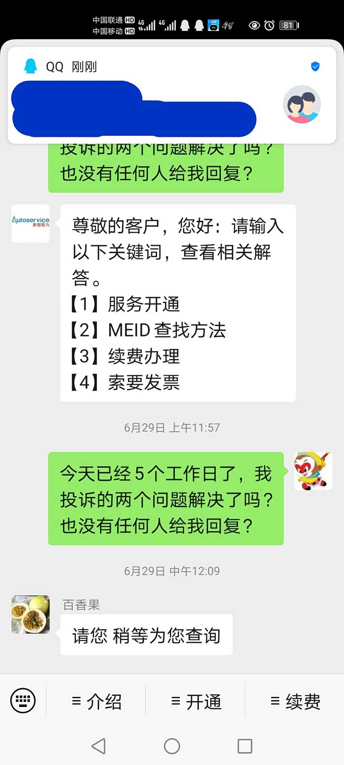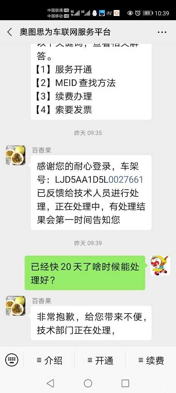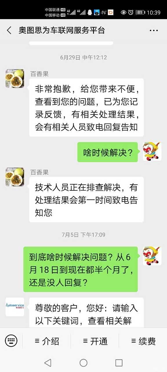 以上两个问题从6月19日反馈给起亚官网和他们提供的奥图思为官方微信号,并电话联系通过电话联系(起亚***,奥图思为4008070018),起亚官网400回复需联系购买车辆的4s店,或者联系奥图思为微信公众号。联系了4s店表示需要厂家解决(6月2x日具体时间记不清楚,7月4日两次开车到4s店检查,4s店员现场也看了现场操作后表示这个问题应该是app的软件或者服务器软件方面问题,维修站无法解决,会帮我联系厂家解决),联系奥图思为通过电话让我做了各种测试包括紧急呼叫,然后告知我“已为你记录反馈,有处理结果会致电告知您”。从2020年6月19日投诉至今,中途大概每隔5天左右我都是追问处理进度情况,期间只有7月3日有个自称奥图思为客服的小妹妹电话打给我说,我反映的问题正在处理,周五7月3日有个服务器维护,维护完会告知我处理结果。截止7月7日无任何人与我联系,7日通过起亚官方微信公众号再次投诉和奥图思为微信公众号询问,起亚官网无任何回复,也无人与我联系,奥图思为公众号只通过公众号回复“非常抱歉,给您带来不便,技术部门正在处理”,至今日2020年7月8日上午10时,仍无任何人给我电话联系,再次拨打起亚***投诉相关问题,回复帮我催促,询问啥时候能解决好,回复无法确定会帮我催促。打奥图思为4008070018,回复技术部门正在处理,询问啥时候处理好,仍然是说“正在加紧处理”。今天(2020年7月8日)电话再次投诉起亚400后中午12点过,4s店打来电话主动问了情况,表示会全力跟进处理情况,但是问到啥时候能解决问题,也无法回答,只是一个劲的说好话安抚我不要生气肯定会解决好(咋个解决好,啥时候解决好?)。