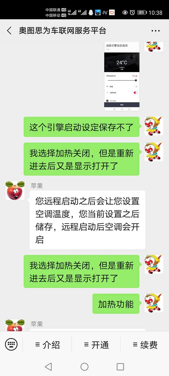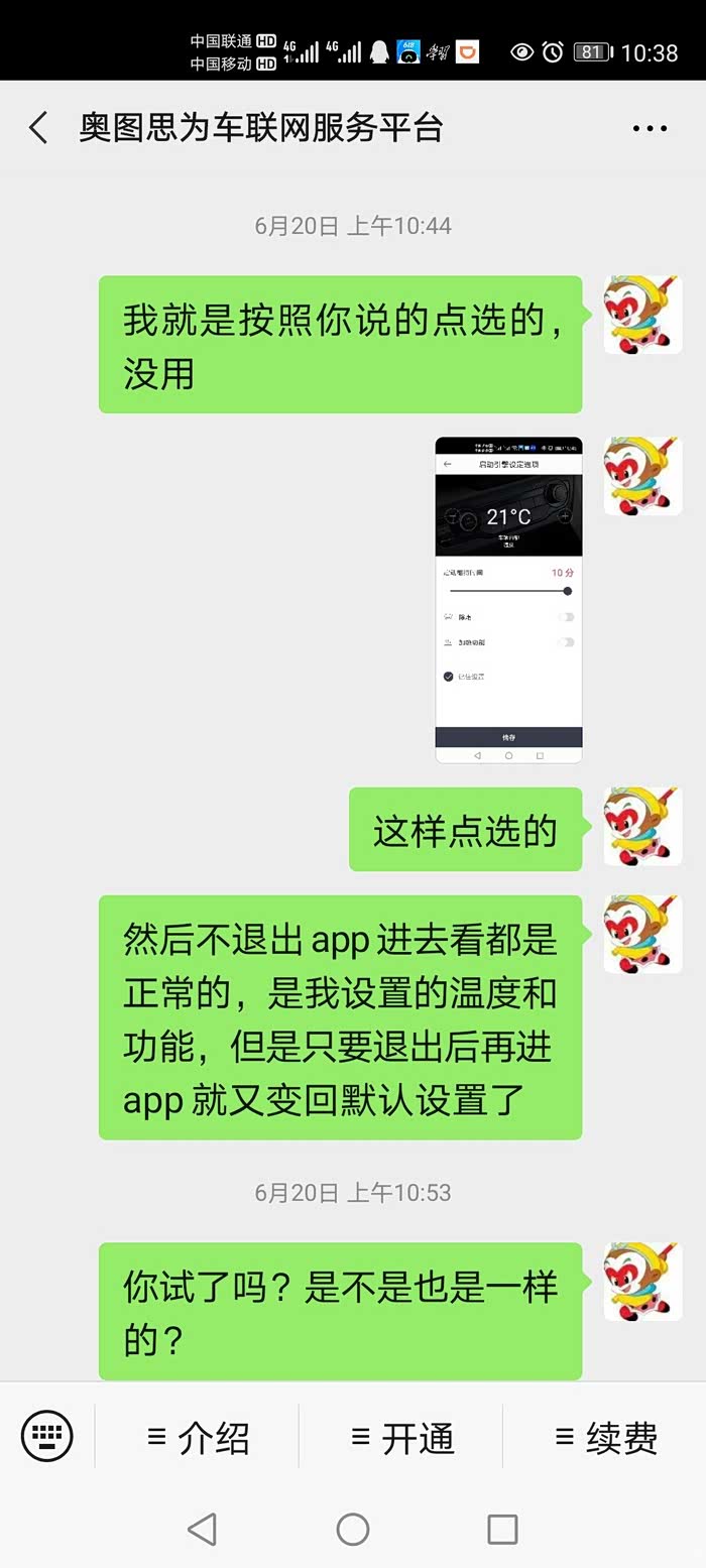 我当时购车时就是因为远程启动对我而言觉得非常有用,车是给媳妇买的,她们单位停车场是露天的,夏天下班在办公室就启动车辆,从办公室下楼到上车大概3分钟,这个时间基本就能把温度降下来所以毫不犹豫加了4000元选装了智能包。这个也是选kx3没选德系X铠,和日系j客的关键原因。至于啥智能巡航这些功能,媳妇用车基本99%时间就是城区,没啥意义,这点我让4s与我联系的售后人员去问问接待我的销售小吴他最清楚。现在这个功能严重影响使用,我已明确给起亚400和4s店联系我的工作人员表示:这个功能性问题严重影响使用,在客户购买时有问题为啥不提前告知?是否存在销售欺诈?如果是厂商事前未发现,那麽在客户反映出现问题后,为什么起亚官方让我找4s店?这个你们4s店的维修部能解决吗?(本人理工科毕业,也算从事信息技术专业,对车机不算专业,但也能看出问题在哪,无法保存设置,只有两种可能,一种是将设置保存在app手机客户端中,那麽修正app手机端的bug就行,另一种是按照账号将设置保存在远程服务器中,修正服务器问题就解决。至于分享功能无法实现多半就是出在远端服务器数据同步。但是无论是那种问题,4s店的维修部能修正软件bug吗?起亚官方让我去找4s,还说4s会联系我,我个人推断这个无非就是套路,谁卖的谁负责,你得去把客户摆平,不要继续投诉,至于问题是否真正解决就不是我400管的事情了。)