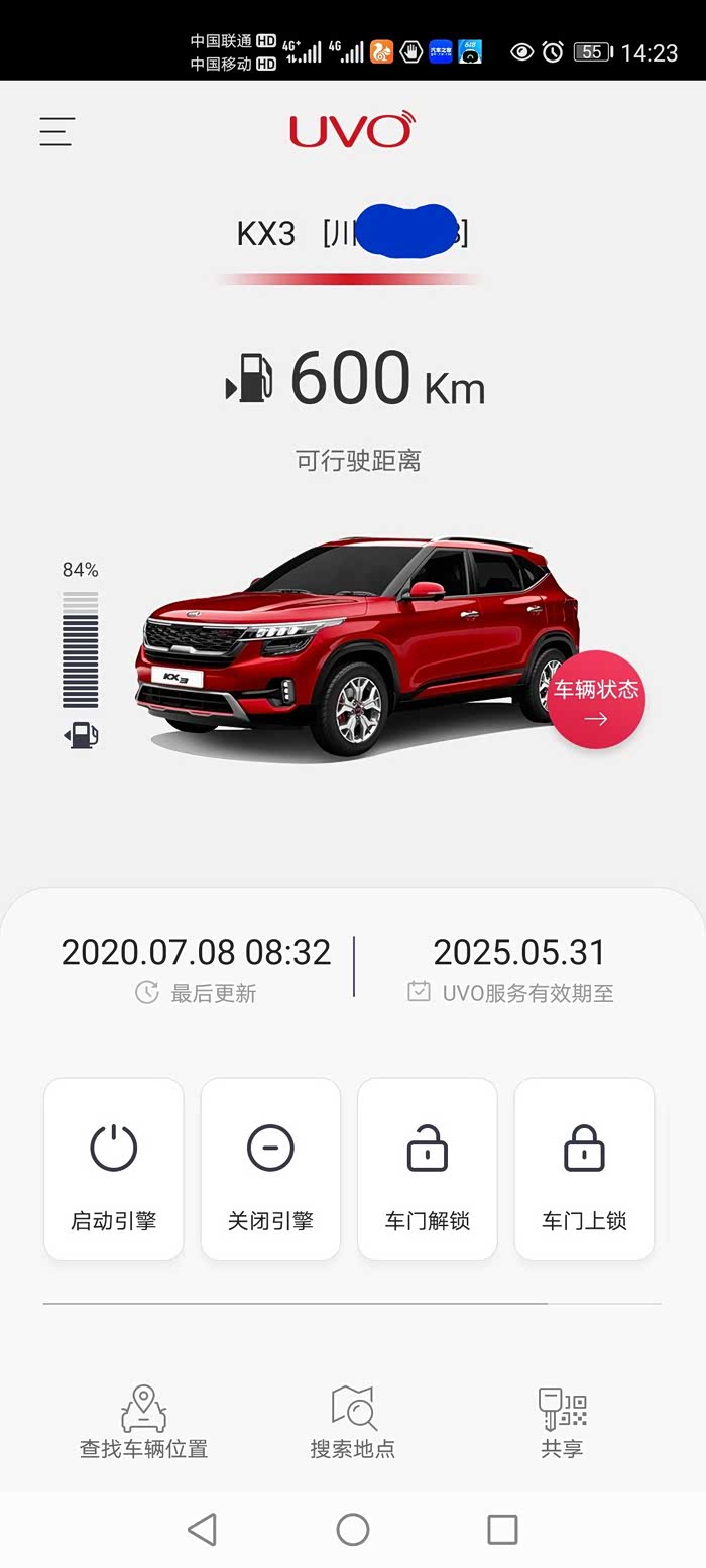 2020年5月中旬订车,6月1日提车起亚KX3智慧版,之前关注过配置,对智能包有远程启动功能觉得非常实用,在4s店看车时,智慧版没天窗,所以订车时加装了原厂设计包和智能包。因保留原牌照导致行驶证未能在提车时办下来,提车时未能开通uvo功能,办理行驶证后在6.19日开通uvo使用发现问题