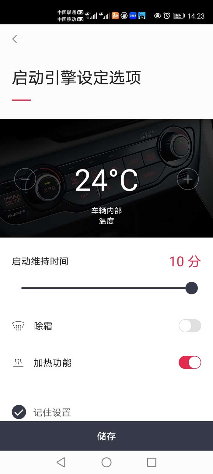 问题2.远程启动app中默认设置车辆温度是24度,除霜功能默认关闭,加热功能默认开启,从设置界面可以设定温度并勾选除霜、加热是否关闭,最下边有个选项是记住设置,进行设置后,只要退出app再次进入app后,所有个人的设置的参数均会恢复成初始设定(温度24度,除霜关闭,加热开启),大热天用个远程启动空调制冷,你还把前档加热默认开启干嘛?