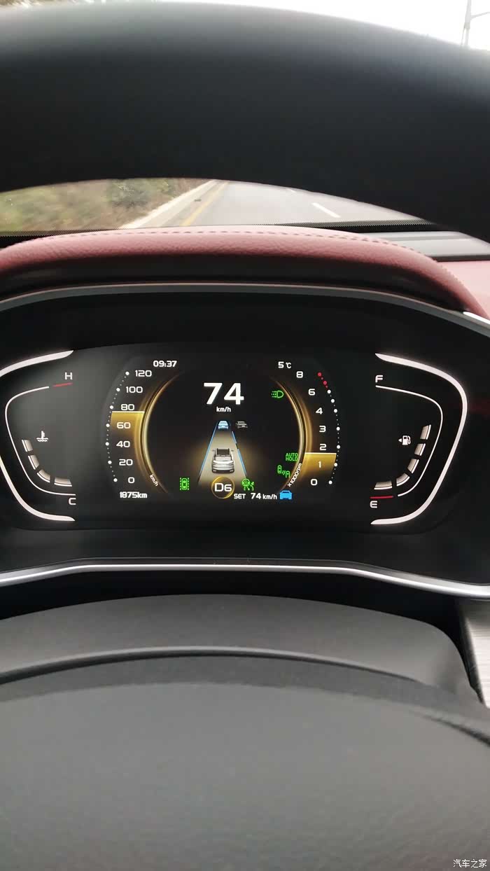 5,SET 74 km/h 这是我设置的车速为74公里每小时。旁边那个蓝色的车标是代表我和前车的距离为安全!(分别有三种颜色:蓝色安全,黄色比较近,红色非常近)