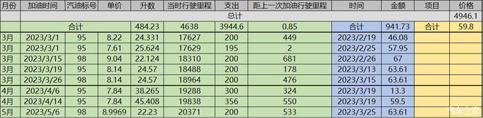 ①3月1号早晨行驶里程为17627公里,截至4月30日最终行驶里程为20260公里,合计行驶里程2633公里。合计加注7次燃油,其中98号加注了3次,95加注了4次合计燃油消耗204.9L,平均百公里消耗燃油7.78L,合计油费支出1651元,平均百公里费用0.62元。