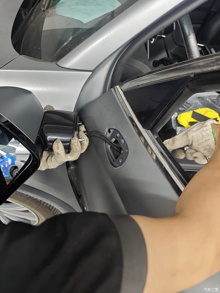当时我还帮师傅,按住新的后视镜方便他上紧螺丝。