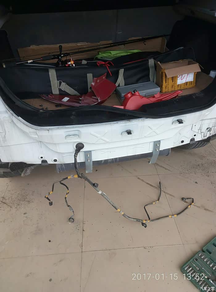 后备箱打开还有两个螺丝,左右各一个,要用专业扳手,我拿普通螺丝刀磨了一个。拆后的样子,这个是后杠灯雷达电线。