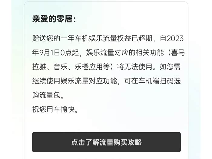 转眼间,我的零跑C11陪我度过一年多的时光。这不,近期收到了来自官方的短信和零跑APP提醒,告知我赠送一年的娱乐流量即将到期,娱乐流量对应的相关功能将无法使用。