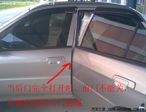 买车后发现左后门中间靠前位置有一小块掉漆,一直以为是在那里剐的或碰到的呢,今天洗车时全部的车门打开后在关闭时发现原来问题出在这里。要是你左边的前后两个门全部打开,这时你要注意了:最好是先关上后门再关前门,否则在后门全部打开到底的情况下关前门、前门就到碰到后面的漆面,这个位置前后门是有一点干涉的。我的漆就这样掉了,虽是一小块,但是挺可惜的。右面的两个门好像要好一点,没有明显这样的情况发生。请各位留意一下你们的车是不是这样。