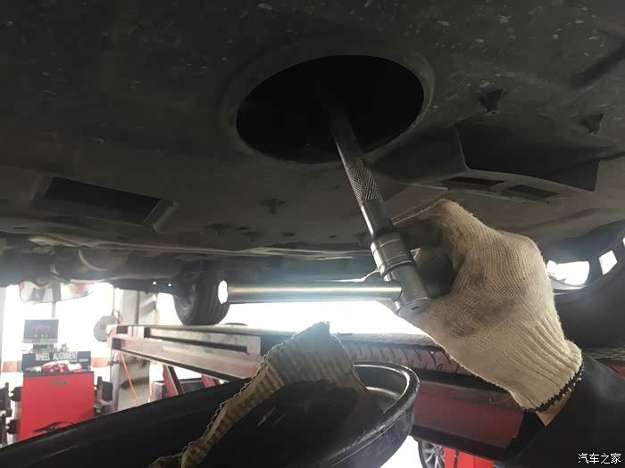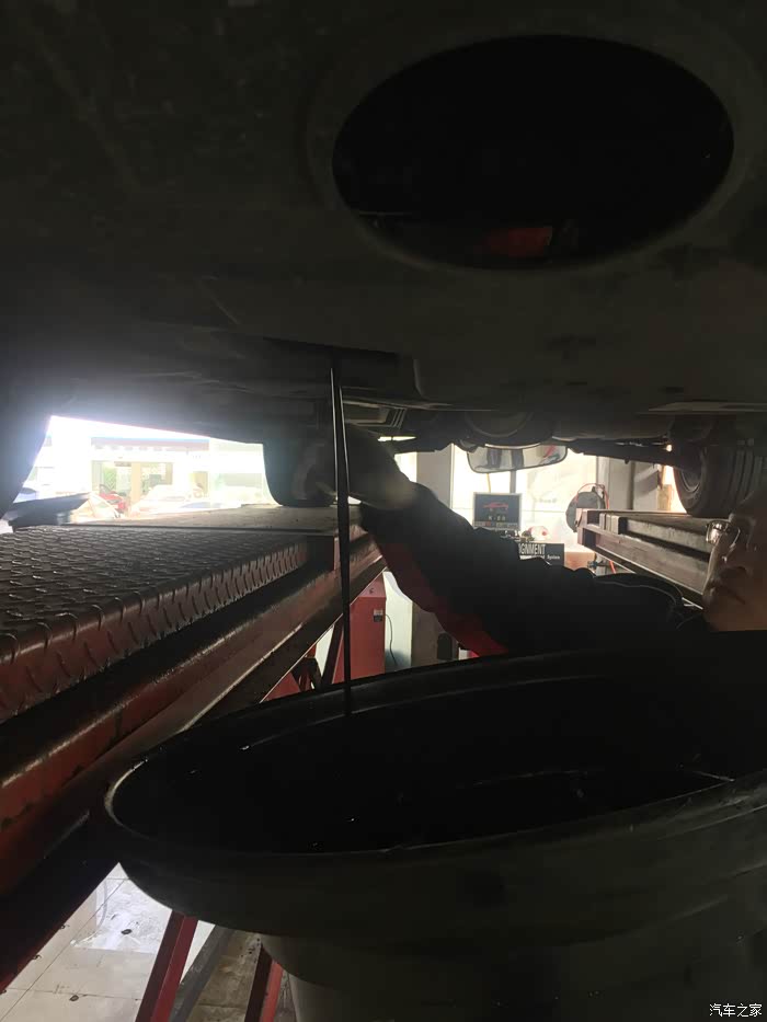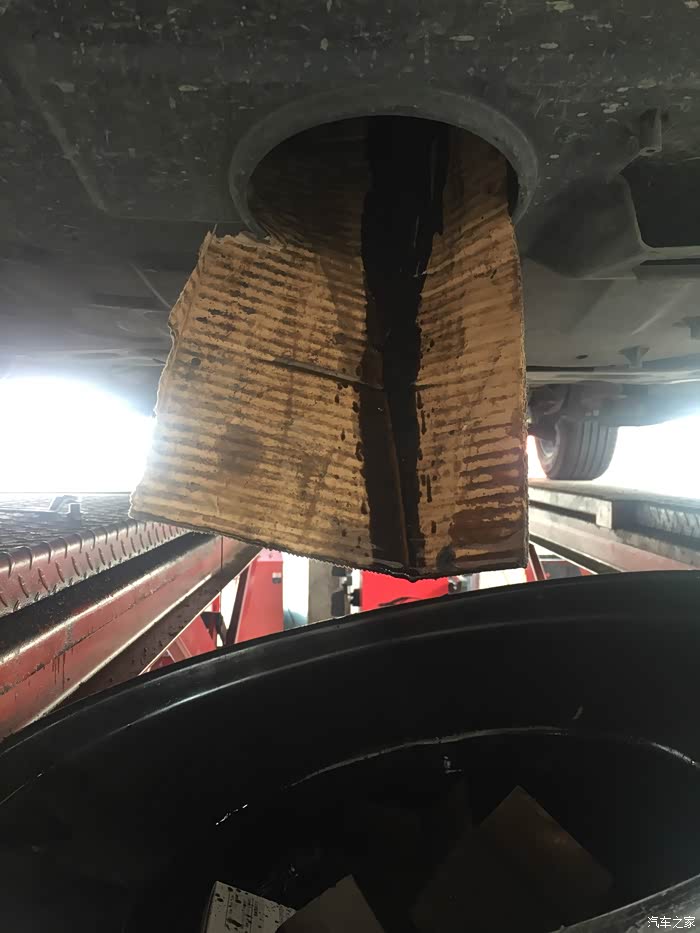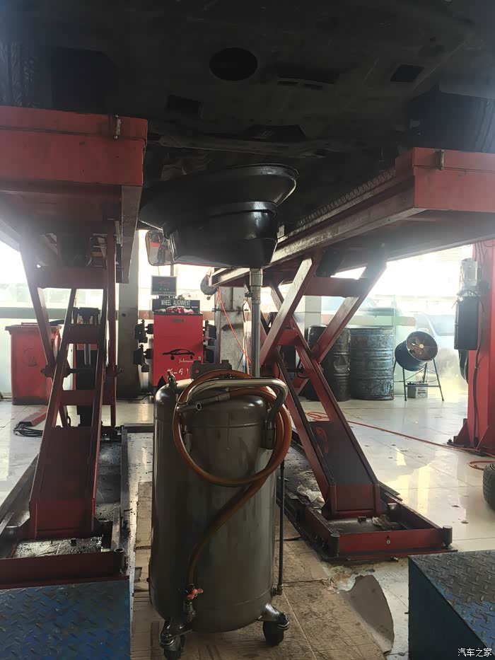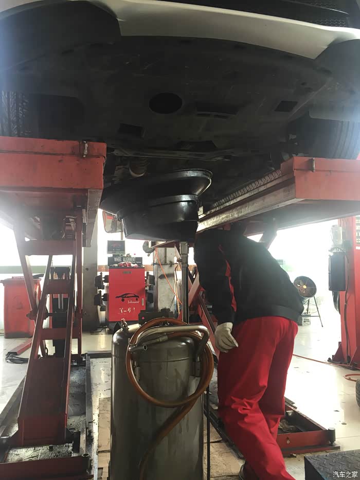 工作人员认真检查一遍,检查底盘情况。就想到一个更彻底的排机油的方法,用鼓风机对折加油口吹气,利用风压将剩余机油排空,不知道可不可以?