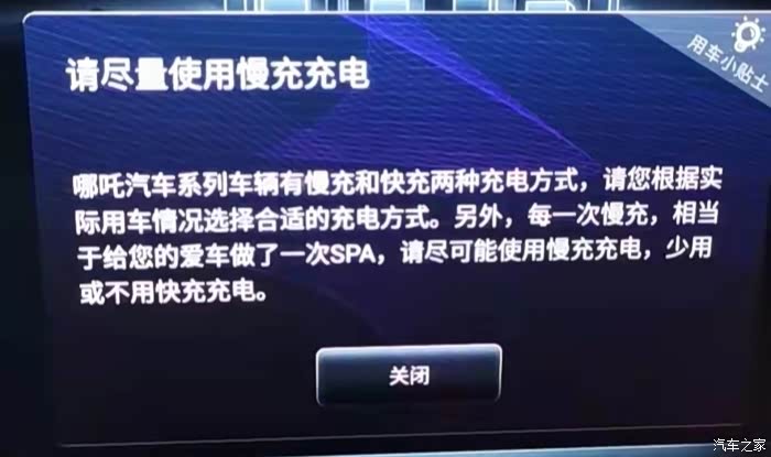 有这些疑问存在非常正常,因为我们从小都有这样的认知:快充对电池不好,细水长流才是王道。事实确实如此,就连哪吒V车机的小提示都说每次慢充都相当于给电池做了一次spa,尽量减少快充次数。