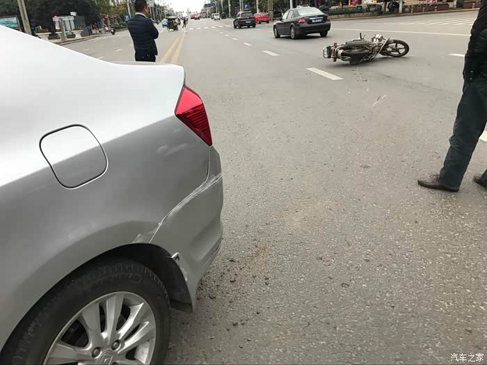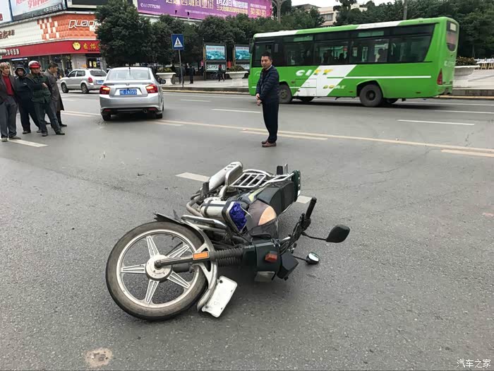 最后摩托车摔倒了,人去医院检查,还好没有大碍,赔钱了事,我的车也受伤了