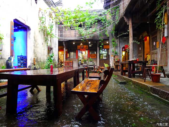 茶杯反扣着放在茶几上,任凭雨水冲刷,想必不下雨的时候,一定有人在这里品茶谈天说地了吧