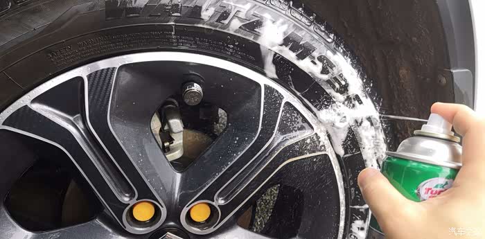 四个轮子都喷上了,大慨五分钟这样泡泡就挥发完了,也可以用海棉手动擦拭