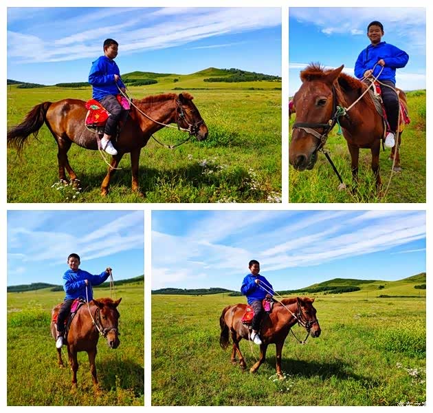 我自己骑在马上都有点紧张,儿子第一次骑马,竟然还很放松,没过一会,他发现这马性格温良,于是不让大爷帮忙牵了。(后来才知道,他竟然一边骑马,一边还自己录了一段抖音