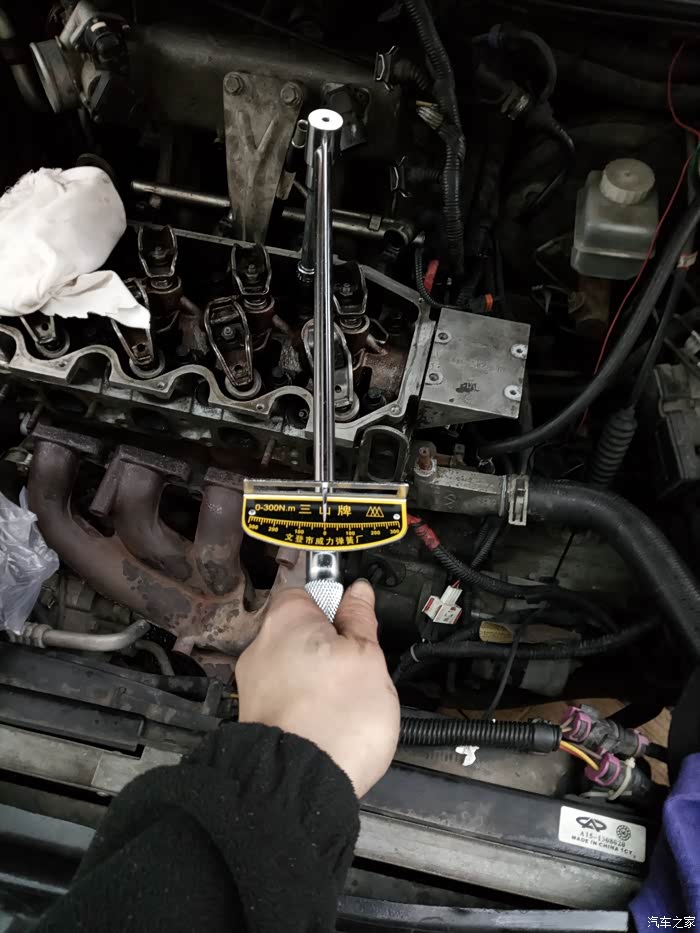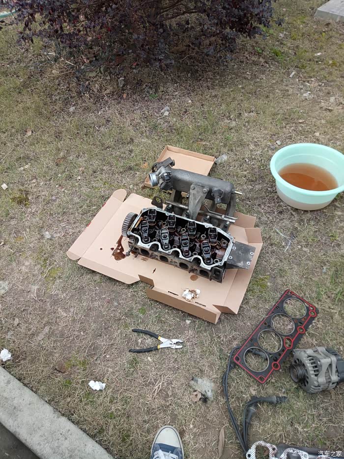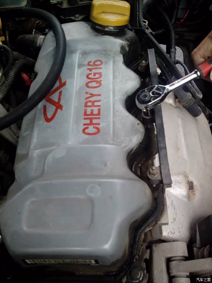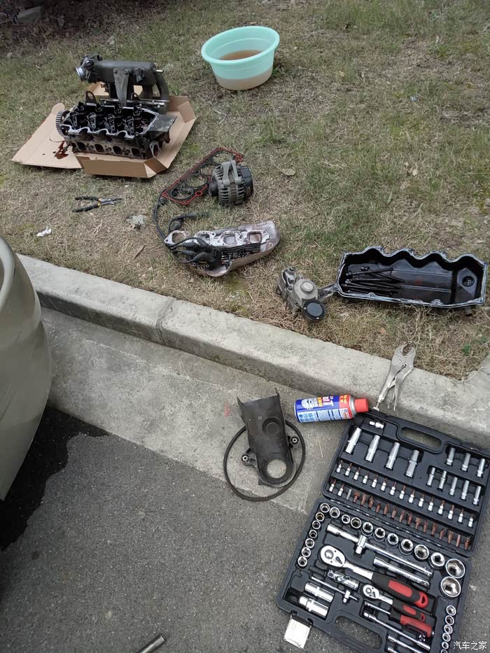 首先把防冻液放掉,因为这破车没有放水阀,只能拆水管,在右大灯下可以看到有个水管与水箱连接着,拆掉后,拧开副水壶,把防冻液吹出来,尽量排干净,防止拆缸盖后把防冻液漏缸机里面。再就是发动机仓各连接线及各种管子(主要是各传感器连接连,油管、真空管、排气分歧管、电机、正时皮带罩等)拆除后,就可以拆气门室盖了。