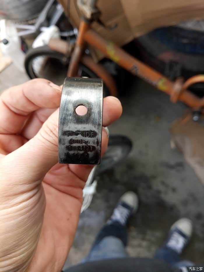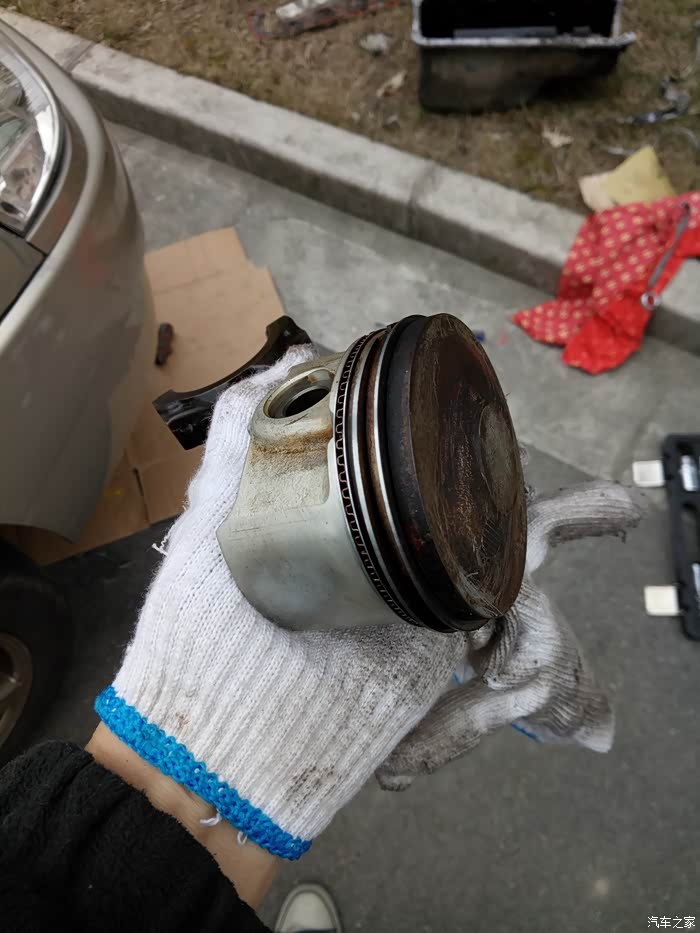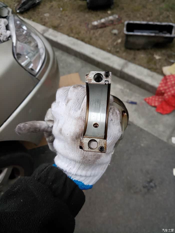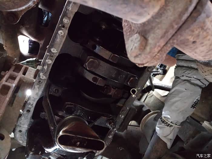 周日开工,MD老天不做美,下雨了,在小区的一玻璃房下的前檐下干活。拆下油底壳后就可以拆连杆了,油底壳打胶太多,用脚都踹不下来,最后慢慢的用平口螺丝刀翘下来的。