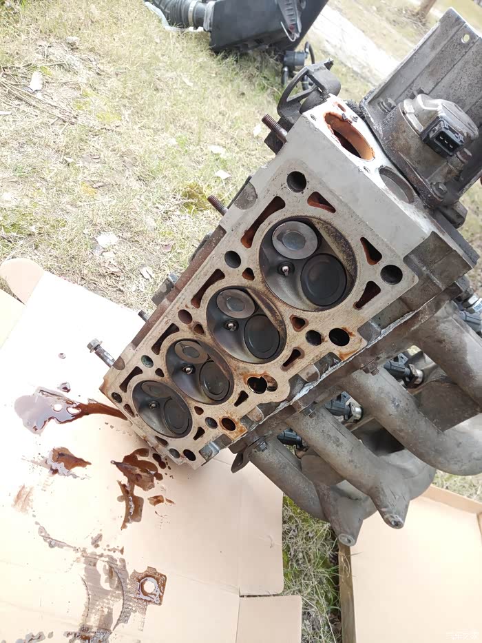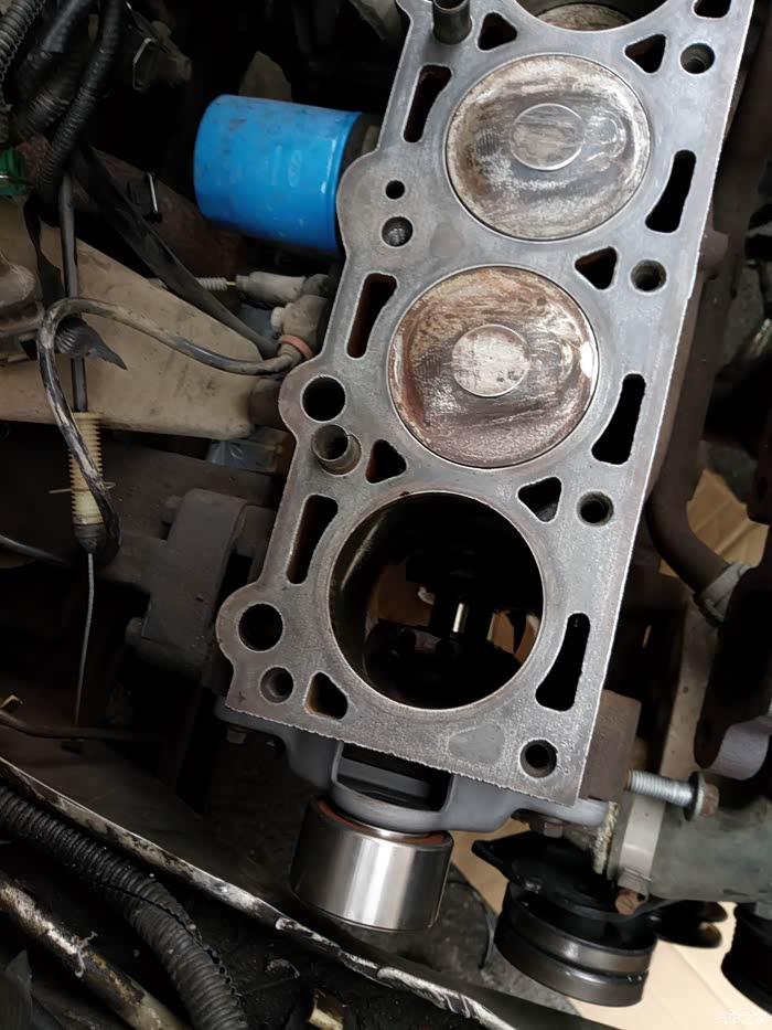 8个气门顶了7个,要全换了,还有个气门摇臂也顶坏了,气门导管顶断了两。因为要上班,周末把缸盖送到开修理厂的朋友那边,让他找专业磨气门的地方去磨气门,配件让朋友带买,基本上是气门8个,石棉缸垫一个,气门导管,气门油封,等等。