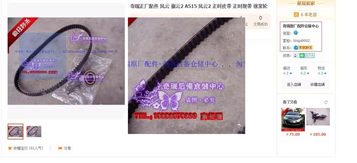 在网上买的所谓的原厂正时皮带用了两万公里后断了,幸亏是晚上下高速后离家不远的地方断的,要不然费用不得了。在这里曝光下淘宝上的这家黑店“奇瑞原厂配件仓储中心”就是这家店大家要小心,在他家买过很多东西,最后一次是买缸线,线很细,本来2013年底买车时对车上的零件正厂和副厂没概念,谁知这缸线用了几次就断了,因急用到10公里外的汽配城买来缸线,一对比发现这家店给的是假货,从些再也没买过他家的东西(他家店里的东西有分正厂和副厂,我付款都是要的正厂货,结果发的是副厂件)。