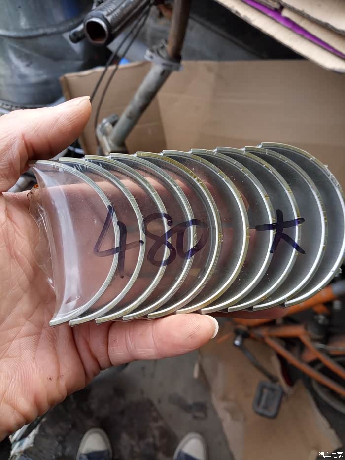 这是原车的小瓦,上面写着480EJ字样,再这里给大家说下,480EJ1.6和1.3的发动机和477的发动机都是用这个瓦,为了这个瓦跑了两趟,冻死了,汽配城老板说卖了10年的配件,第一次看到480的小瓦和477的一样,呵呵!