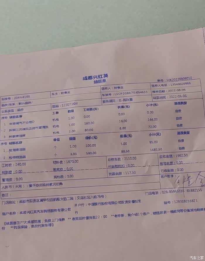 在兴红英4S治理项目:拆下喷油嘴4支(由于烟尘超标需调校喷油嘴) 、拆下三元催化,消音桶、油路等项。 治理费用1992.50元。检测费220元。共计2212.50元