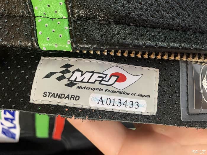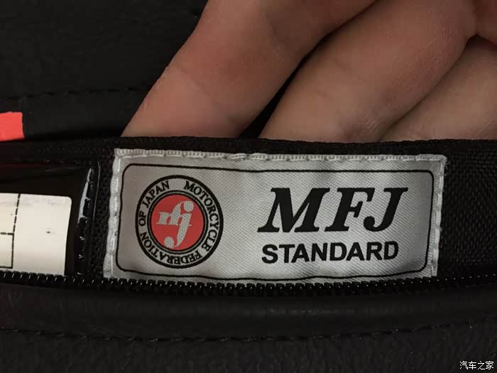 老版MFJ认证标志,再过两年,这样的皮衣就不能穿着参加比赛了。(摩托车比赛前有车检,会对车子和车手的装备进行检测,看是否符合标准。