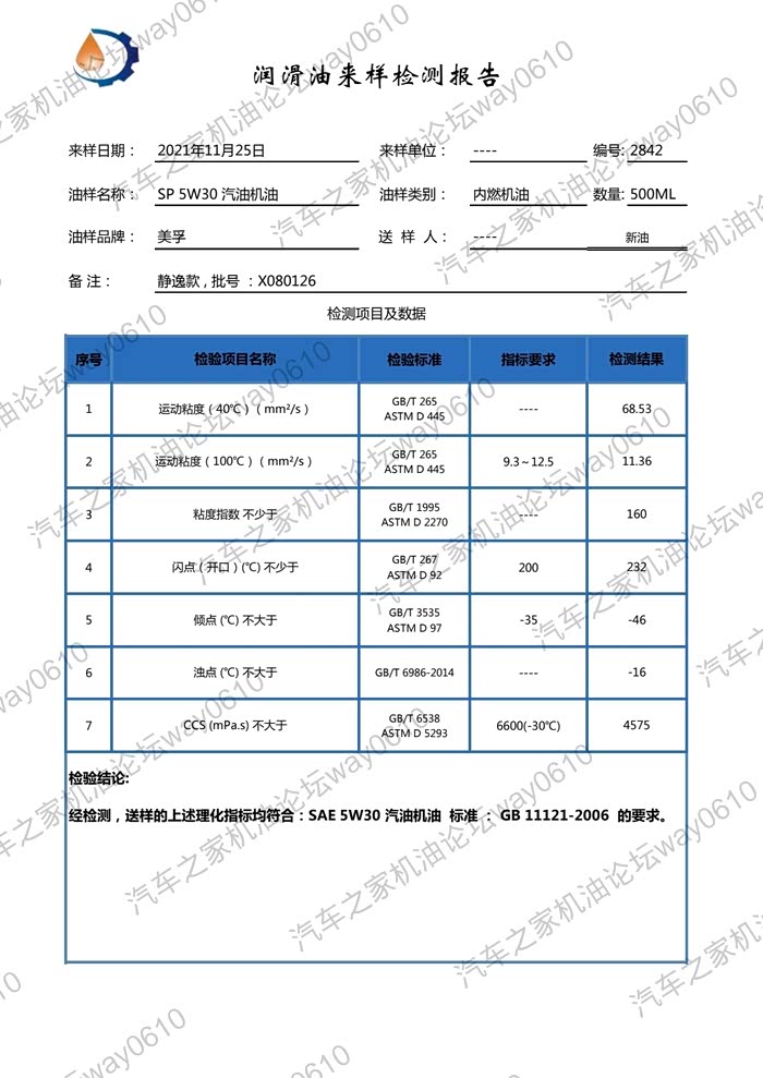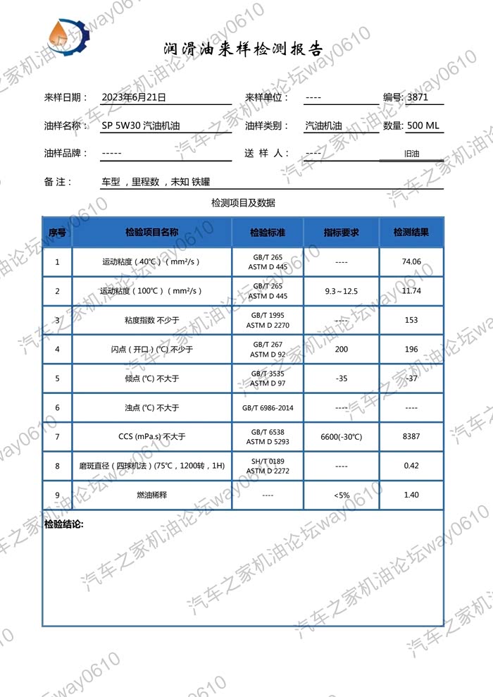 3.100度运动粘度,新油11.36,废油11.74,废油是升高的但不多,上幅为:(11.74-11.36)/11.36*100=3.4%。一般来说粘度升高是机油氧化衰减导致的,但燃油添加剂用量过高也会导致粘度升高。
