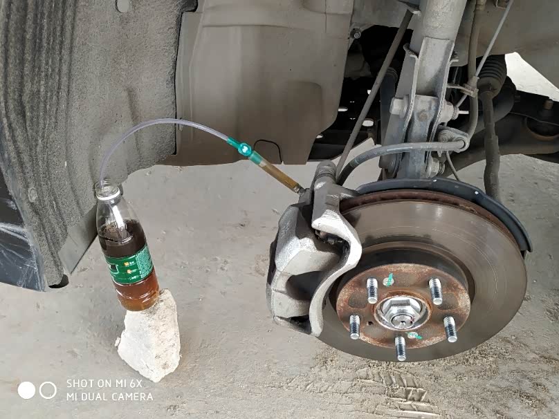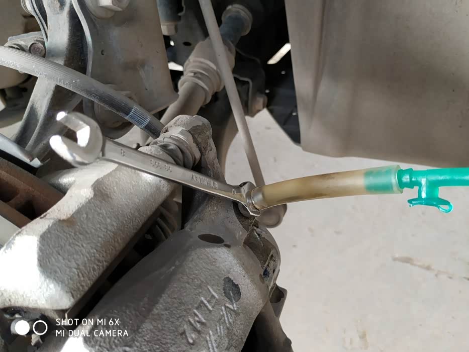 前轮使用的m10扳手,通电踩脚刹,注意油壳油量,每十下添加一次并拧紧盖子,踩12下脚刹留意一下油品,大概15下就能放出旧油