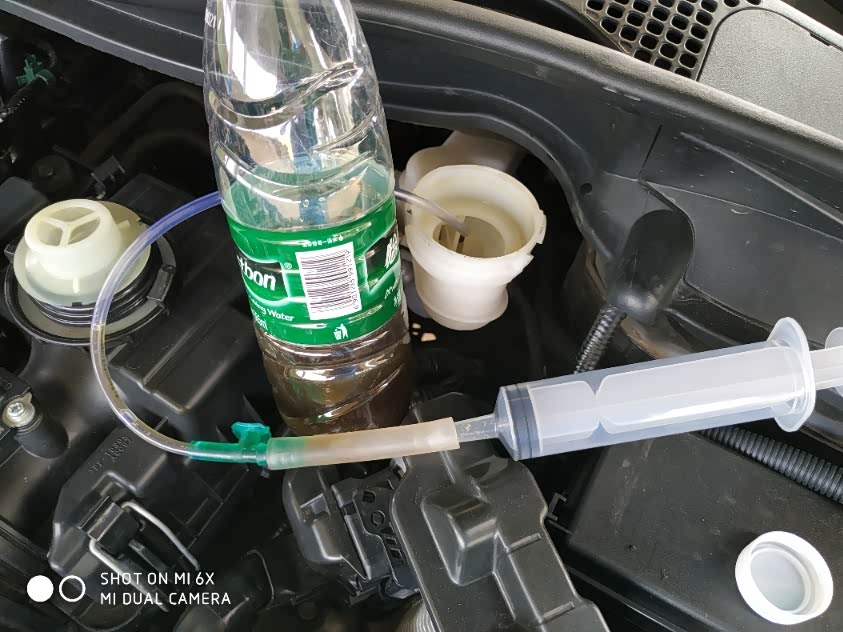 打开加油口用针筒及软管抽出旧刹车油,并添加新刹车油