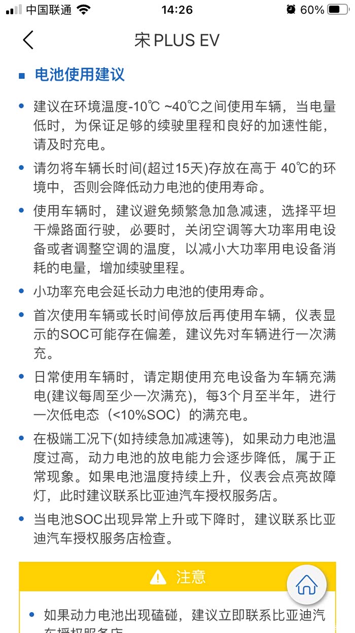 今天抽空看了一下比亚迪宋plus ev说明书,其中有一部分关于动力刀片电池的使用建议分享给大家: