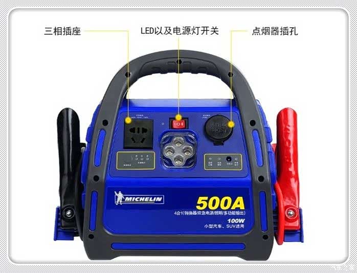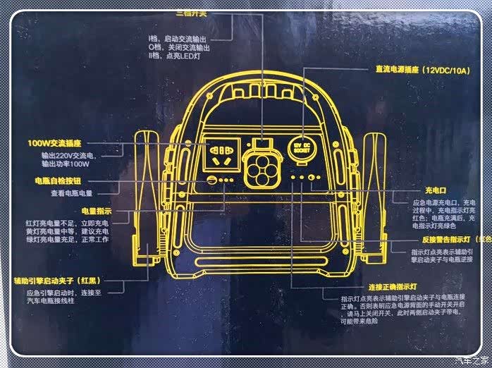 此款产中自带有四个LED灯泡,可以在野外露营时,能提供?长时间照明等,把黑夜变成白天。回归正题民,产品的最重要的功能当然是应急启动啦,它采用铅酸电池作为启动电源,启动瞬间可以提供500A大电流,相比于锂电池具有电压平稳 ,不会发生过压危险。电瓶夹采用红黑双色区分开,并具有防反接功能,就算脑残司机也不会搭错正负极。