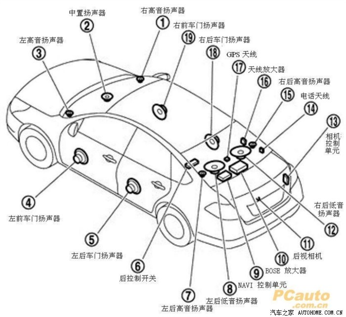 其实公爵 还有部分天籁的音响系统都采用BOSE的不过本人的车没采用就自己换个喇叭 公爵喇叭示意图