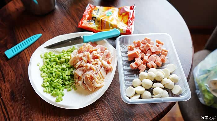 食材:鱼丸、火腿、培根、榨菜、西芹、鸡蛋