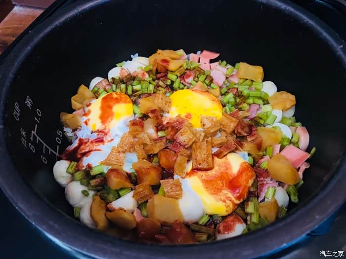这个焖饭是早起在酒店做好的一直是保温状态,用车载逆变器正常加热下就可以直接吃喽。