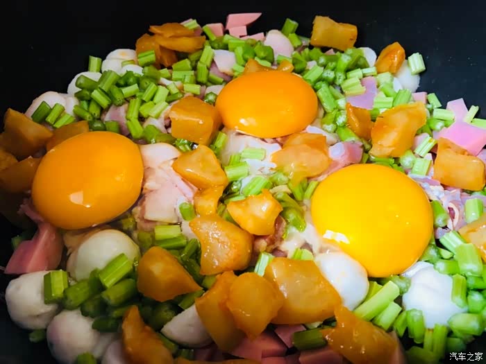 4.直接磕进去三个完整的鸡蛋,让蛋清流入米饭内,蛋黄浮于表面即可。