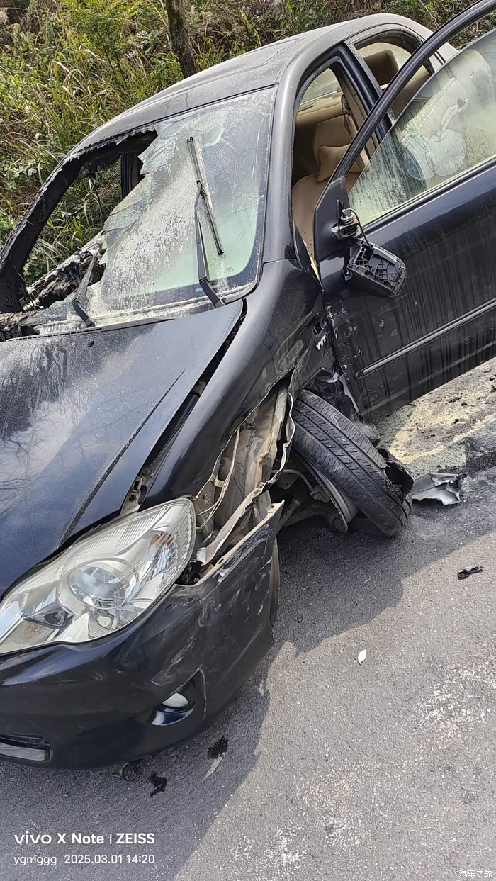 ,眼瞎了的白车直冲过来,整个车身都占了我的车道,我往右打方向盘,也没能避开,“蓬蓬”,双气囊同时爆出,中控台马上冒烟并燃烧起来,我立马准备拉开车门跑出来,但车门打不开,副驾驶门也打不开,我立即放倒靠背爬到后排,后排两侧车门也打不开,破窗锤也想不起放哪里了,只有对着车窗使劲踹,踹了十来脚也没踹开,浓烟和火势越来越大,呼吸越来越困难,我又对着车窗踹了十来脚,才把车窗踹开,爬了出来