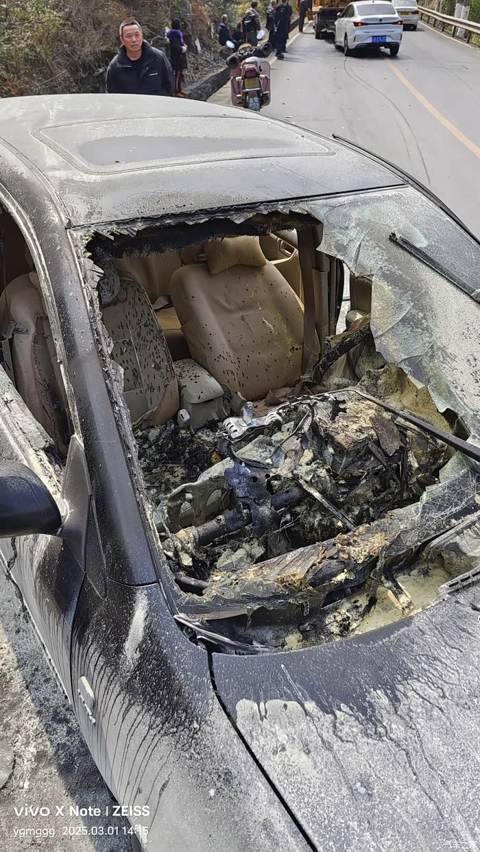 。出来连忙找灭火器,灭火器也找不到(现在我都不知道我自己的灭火器是怎么取出来的,但一粒灭火剂也没有喷出来),叫前后的小车司机,帮把手灭灭火,谁都没动,感谢照片中的大货车司机,他们(夫妻?)立马停车,取出两具大灭火器灭火,两具灭火器的灭火剂都喷完了,都还没完全喷熄,大货车司机又去提了半桶水才淋熄。事后,我给司机灭火器钱,司机也没要,感谢🙏🏻感谢🙏🏻。提醒司机朋友们,什么都可以省,灭火器,破窗锤绝不能省,而且要放在顺手的位置,还要感谢我这170斤的老骨头,要是体弱一点,明年的今日,可能就是我的周年纪念日[囧]