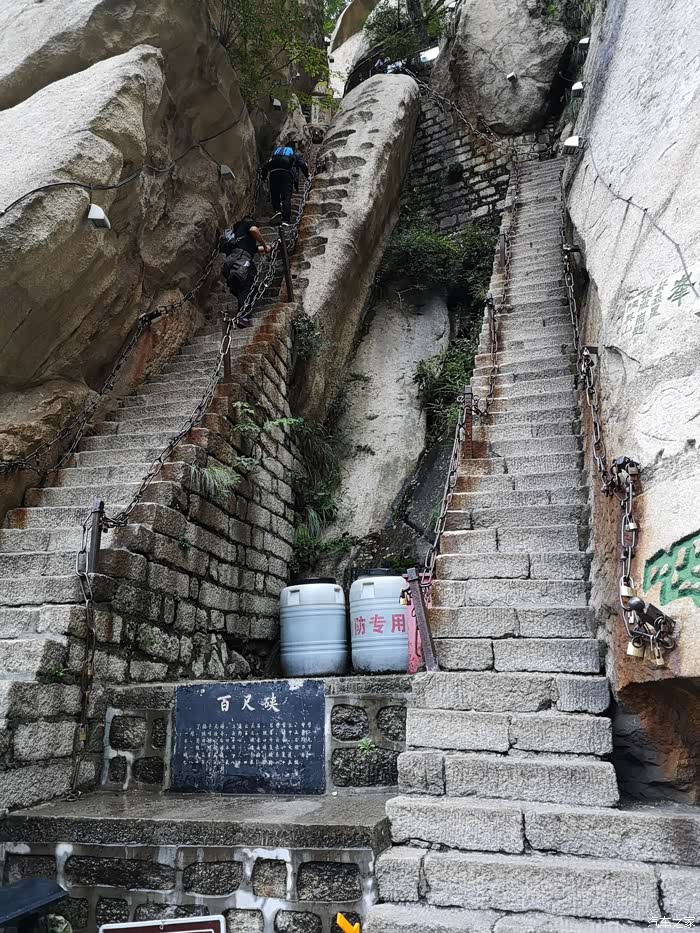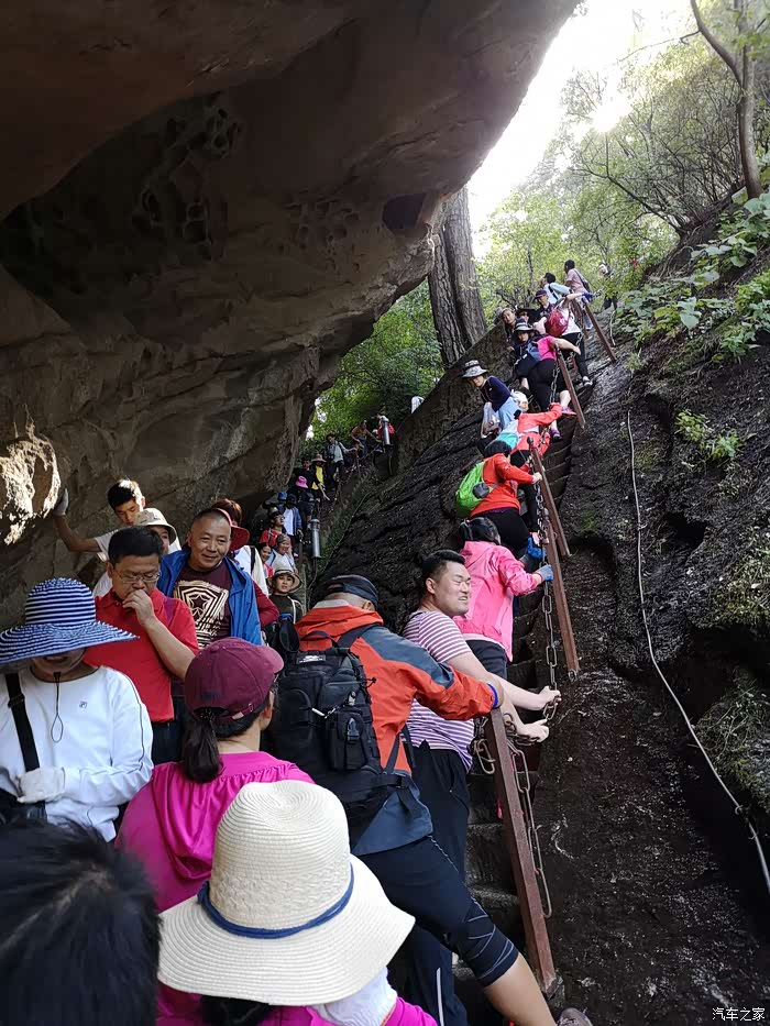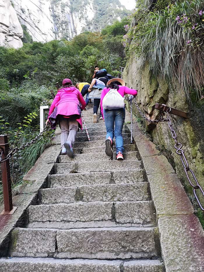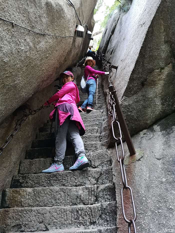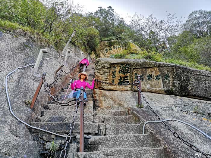 从避诏崖往南峰上,经过这个地方,一般应该是右边的阶梯供游客上行,左边的供下行。有几个下行游客可能觉得右边的阶梯比较好玩,就从这边下了,导致队伍发生了拥堵。为此还有几个游客发生了口角,差点掐架。出门在外图个开心,何必呢?每个人都自觉点,真要做错了主动道歉认错就什么事情都没有了