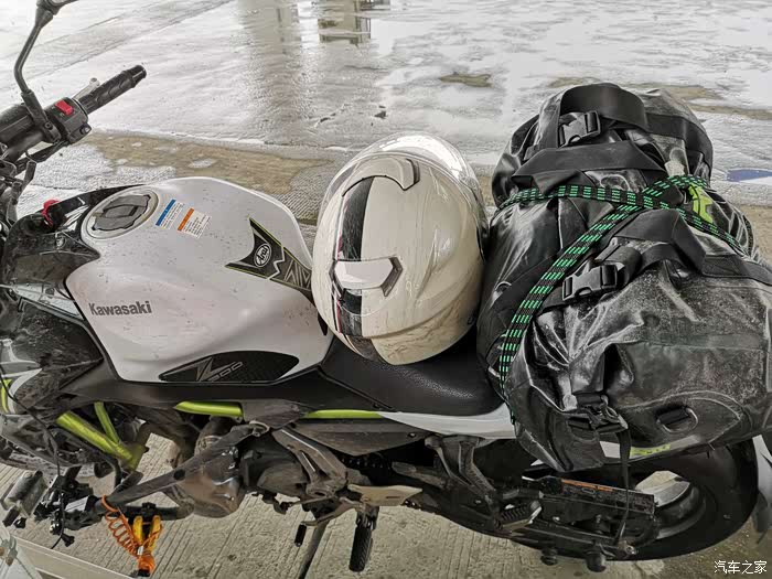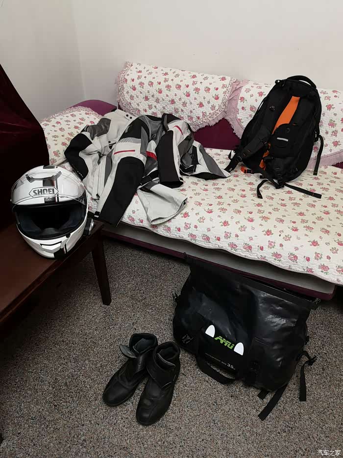 最后是一些必要的准备工作。1、约伴。摩旅的路上充满未知,有人同行总有个照应。可惜身边的摩友嫌远的,没时间的,家里不同意的,约不到。论坛上发帖约跑,除了约来一些鼓励祝福和建议,也没约到同行的人。算了,反正去年一个人都跑到辽宁了,大不了今年继续一个人跑。2、车子保养。8月中旬的时候,车子的里程是6400多公里。虽然可以多跑跑再保养,但为了行程顺利,还是专门跑到金华川崎店去做了一次保养。3、携带物品。因为车子的装载能力有限,所以携带的物品尽量从简。除了必不可少的人车证件、手机、充电器和现金之外,我准备了长短衣物各两套,袜子内裤若干,休闲鞋一双,洗漱用品一套、雨衣一套,补胎工具(辣条)一套,便携高压气筒一只。另外看情况还带了自拍杆、保温杯等一些零碎的物件。这些都装在一个35升的后座防水包和一个35升的背包里。