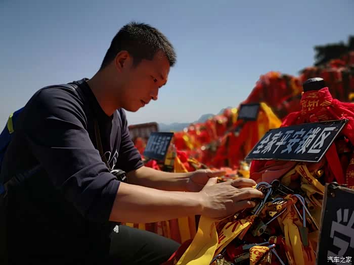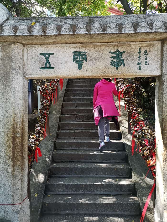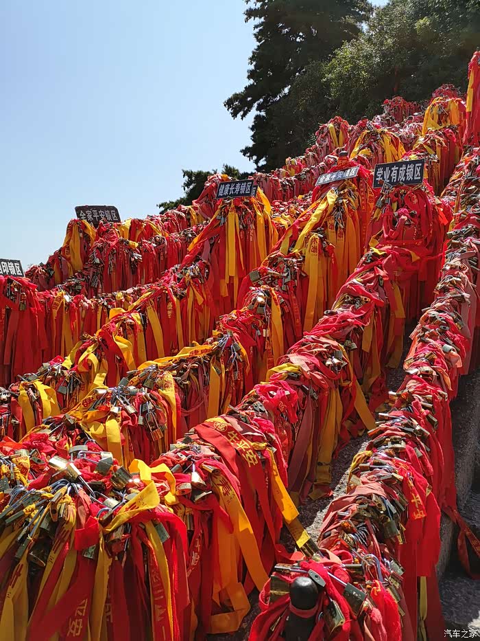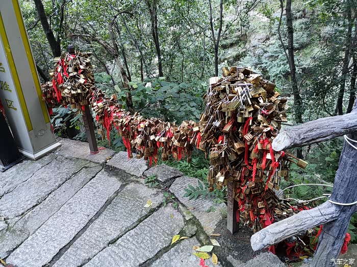 既然来了,咱也挂一个,愿全家平安。挂锁当然不是免费的,这里有个几个小摊,挂的牌子写着“挂锁十元”。过去一打听,十块是最小的,勉强能刻下一个人的姓名。大一点的自然价格也更高,最大的好像要一百多。我要刻自己和妻子儿子的,就选了个中等的,摊主说68。68就68吧,在一个本子上写上一家三口的名字,摊主就开始刻了。刻完把锁交给我,再把我连人带锁交给挂锁区的一个小伙子,说他会教我怎么挂锁。小伙子很严肃地告诉我,他会给我一个黄色的.......布条(叫什么忘了,就是这些锁上都系着的布条,买锁的时候是没有的),布条不是赠送的,是需要我“请”的,38“请”一条。我拿到后,得按照他说的几个动作(忘了)先做一遍,然后把锁锁到挂锁区,再把钥匙扔到山下去。挂完锁付钱,68+38,总共是106
