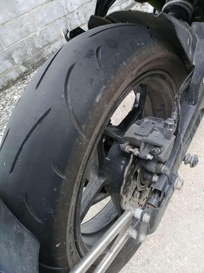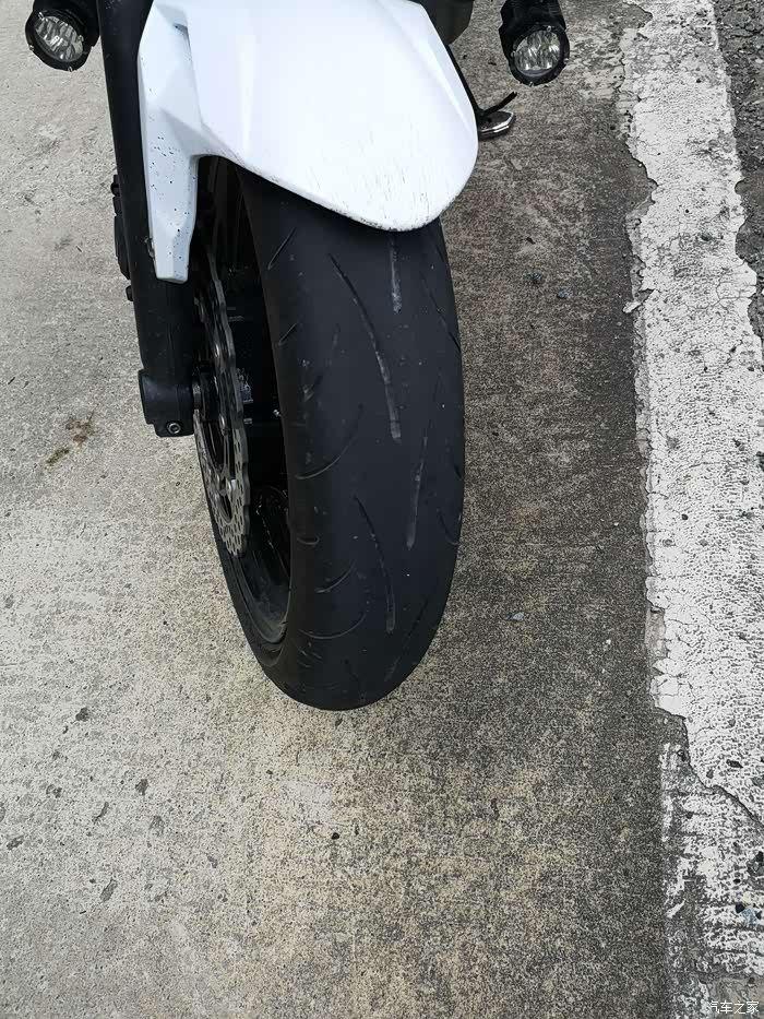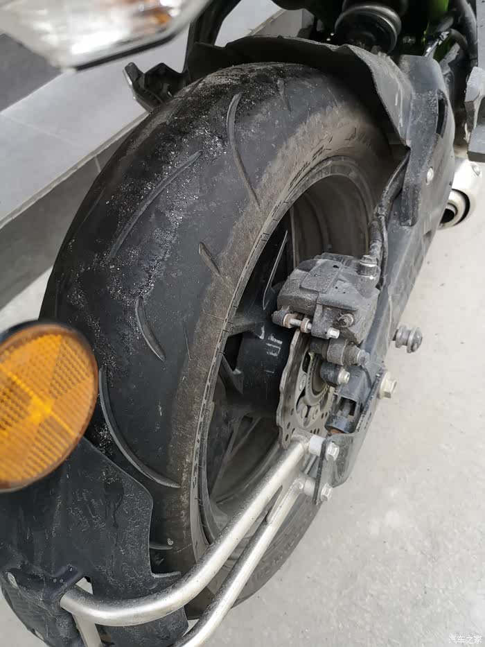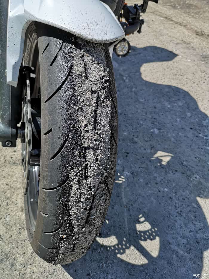 刮完就上路继续出发了,其实那会儿心里也没底,不知道轮胎到底会怎么样。开了几公里后下来一看,轮胎彻底干净了