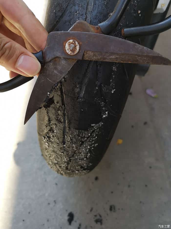大中午的,我在太阳底下蹲在一个农村小卖部的门口,从11:47开始刮轮胎,一直刮到了12:48。功夫不负累死人,效果还是比较明显的