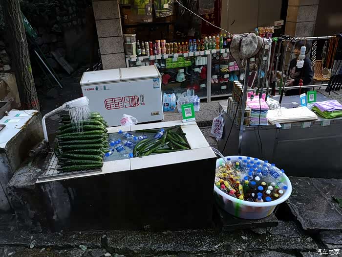 路边的小黄瓜、矿泉水和饮料,都是直接用山泉冰镇的。摸了一下泉水,确实有点冰
