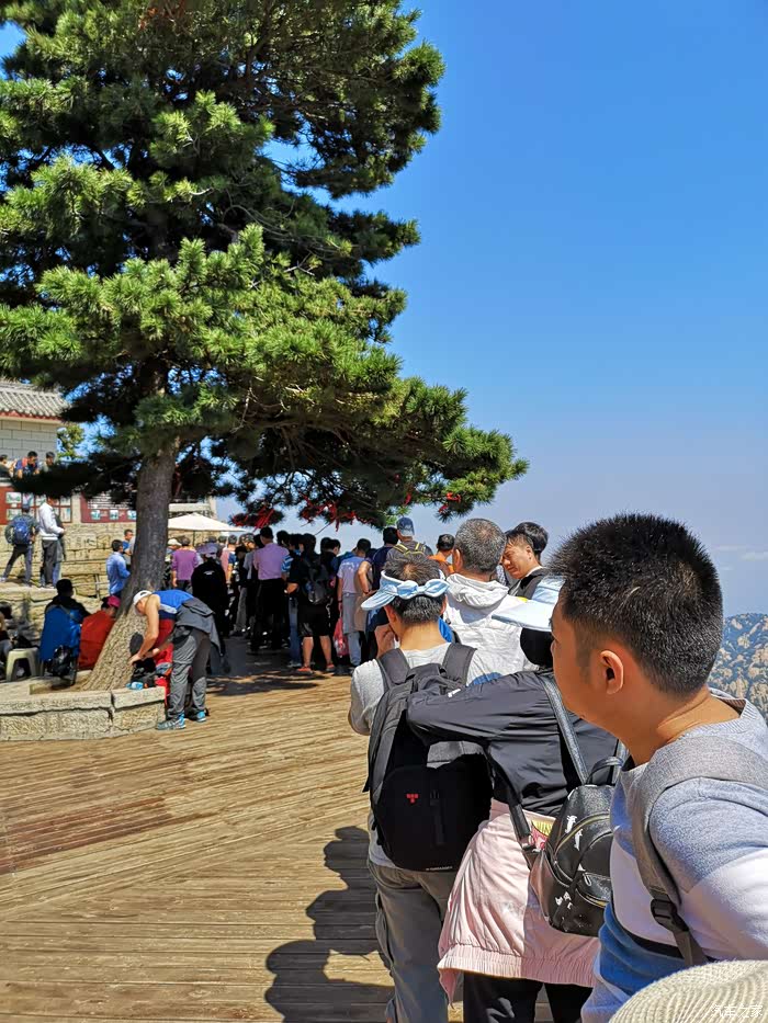 东峰顶上的鹞子翻身景点,排了很长的队伍。我和米娜兴趣浓厚,立刻排到队伍后面。虫儿飞表示无感,就找了个阴凉的地方,等了我俩一个多小时