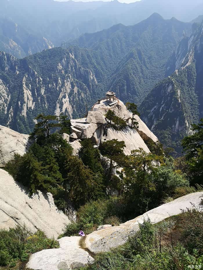 西峰顶下来往北走一点,为了到这块探出崖壁的石头上拍张照片,着实让我闹心了一阵。因为地势险要,这块石头是被锁链拦住的,要拍照的话得先翻出锁链。我的初衷是翻过去让米娜用手机帮忙拍几张就好。这里有几个专门给人拍照的,一看我要翻锁链,热情得不得了,又是搀又是扶的。我说了用自己手机拍就好,但一见我坐上石头了,就立马开始指点我他们那三个千篇一律的POSE,并顾自开始拍。等我拍完下来了,也是很热情得再次帮我从锁链外扶进来。等我进来后,他们直接就要带我去选照片。想着他们如此热情,我不要似乎也有点不好意思,想着一张照片应该也不贵。后来一问,小的一张六十,大的一百二。我去,真是贫穷限制了我的想象,真特么敢要价!我说那我不要了。这下两三个人立马翻脸了,说什么他们又帮我拍又帮我扶了,不能说不要就不要。好家伙,不要都不行了。我又问了句:底片能给不?又是横着脸回答:我可没答应底片给你。想想几十块钱真不值得添麻烦,付钱走人